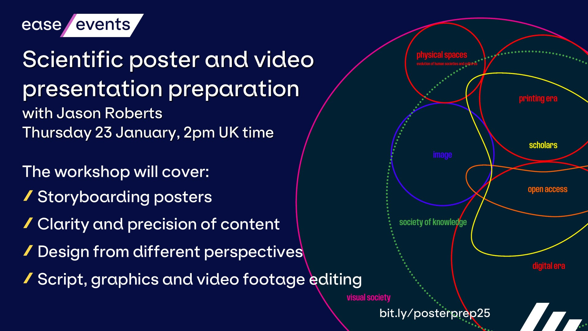 O workshop promovido pela EASE(European Association of Science Editors) tratá detalhes sobre a construção de pôsteres, evidenciando clareza e precisão de conteúdo, diferentes perspectivas de design, além de roteiro e edição de gráficos e vídeos.